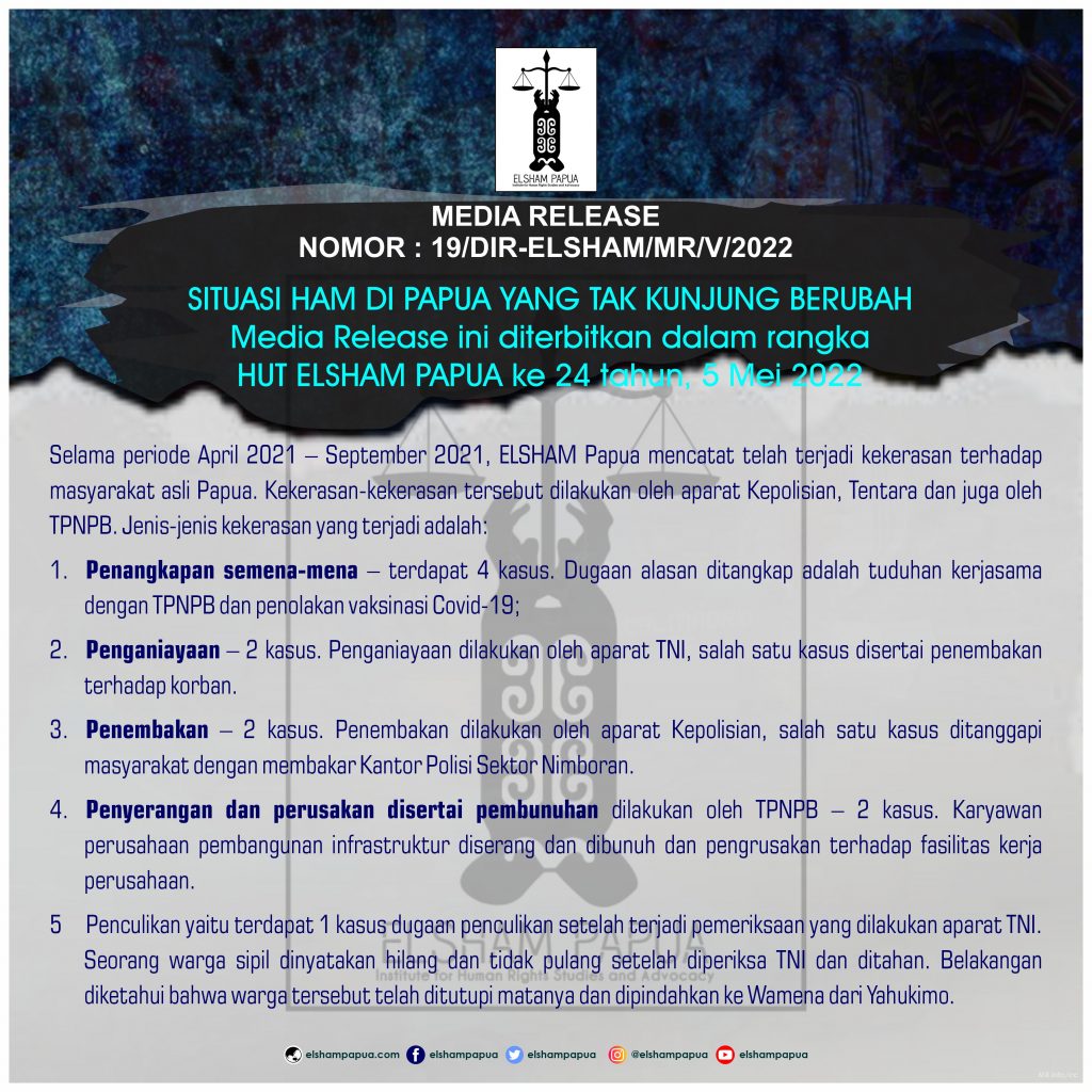 Media Release ini diterbitkan dalam rangka HUT ELSHAM PAPUA ke 24 tahun, 5 Mei 2022