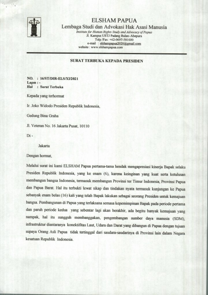 Melalui surat ini kami ELSHAM Papua pertama-tama hendak mengapresiasi kinerja Bapak selaku Presiden Republik Indonesia, yang ke enam (6), karena keinginan yang kuat serta ketulusan membangun bangsa Indonesia, termasuk membangun Provinsi ter Timur Indonesia, Provinsi Papua dan Papua Barat. Hal itu terbukti lewat sikap dan tindakan nyata termasuk kunjungan ke Papua sebanyak enam belas (16) kali yang telah Bapak lakukan sebagai seorang Presiden untuk kemajuan bangsa. Pembangunan di Papua yang terlaksana semasa kepemimpinan Bapak pada periode pertama dan paruh periode kedua yang sebentar lagi akan berakhir, ada begitu banyak kemajuan yang nampak, hal itu sungguh membanggakan, pengembangan sumber daya manusia (SDM), infrastruktur diantaranya konektifitas Laut, Udara dan Darat yang dibangun di Papua dengan tujuan supaya Orang Asli Papua tidak tertinggal dari saudara-saudarinya di Provinsi lain dalam Negara kesatuan Republik Indonesia.
